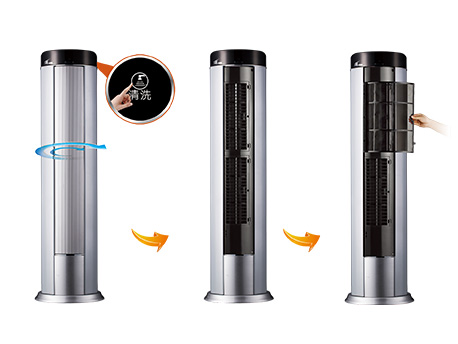 关机状态下按“功能”键,即可调亮“清洗”键,轻触“清洗”键即让过滤网自动旋转至机子正面,拆下过滤网即可清洗。